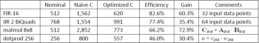 The Efficiency figures are calculated as the Nominal percentage w.r.t the Optimized-C actual cycle count. Thus, 50% efficiency on a 200 cycles nominal means an actual execution in 400 cycles. The Gain figures represent the relative reduction in cycle count of the Optimized-C w.r.t the Naïve-C implementation.
