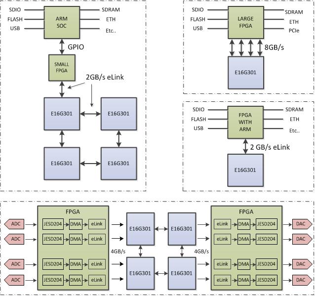 The E16G301 product can be used in a number of different system configurations, some of which are shown in this section.