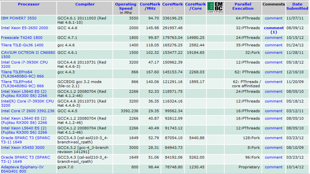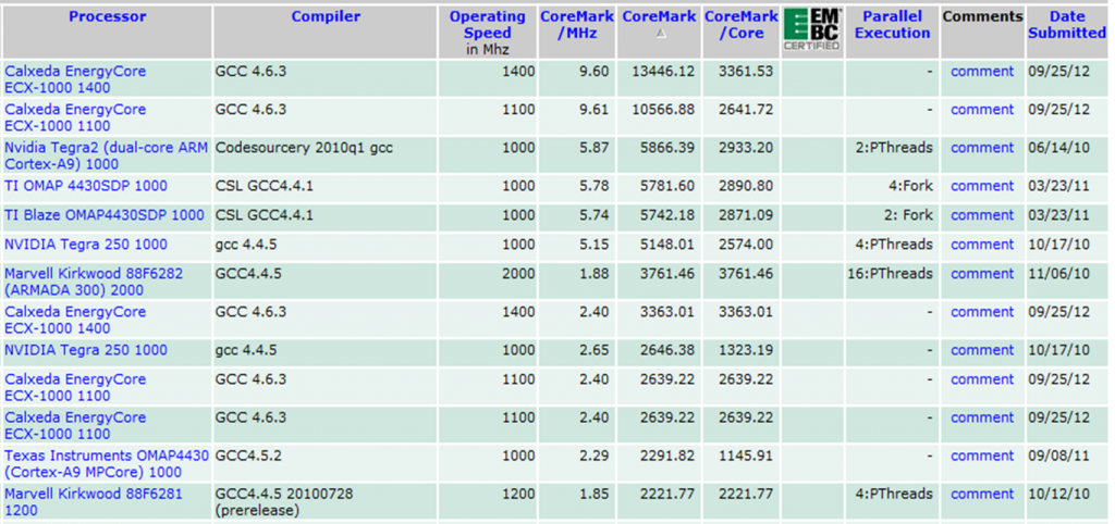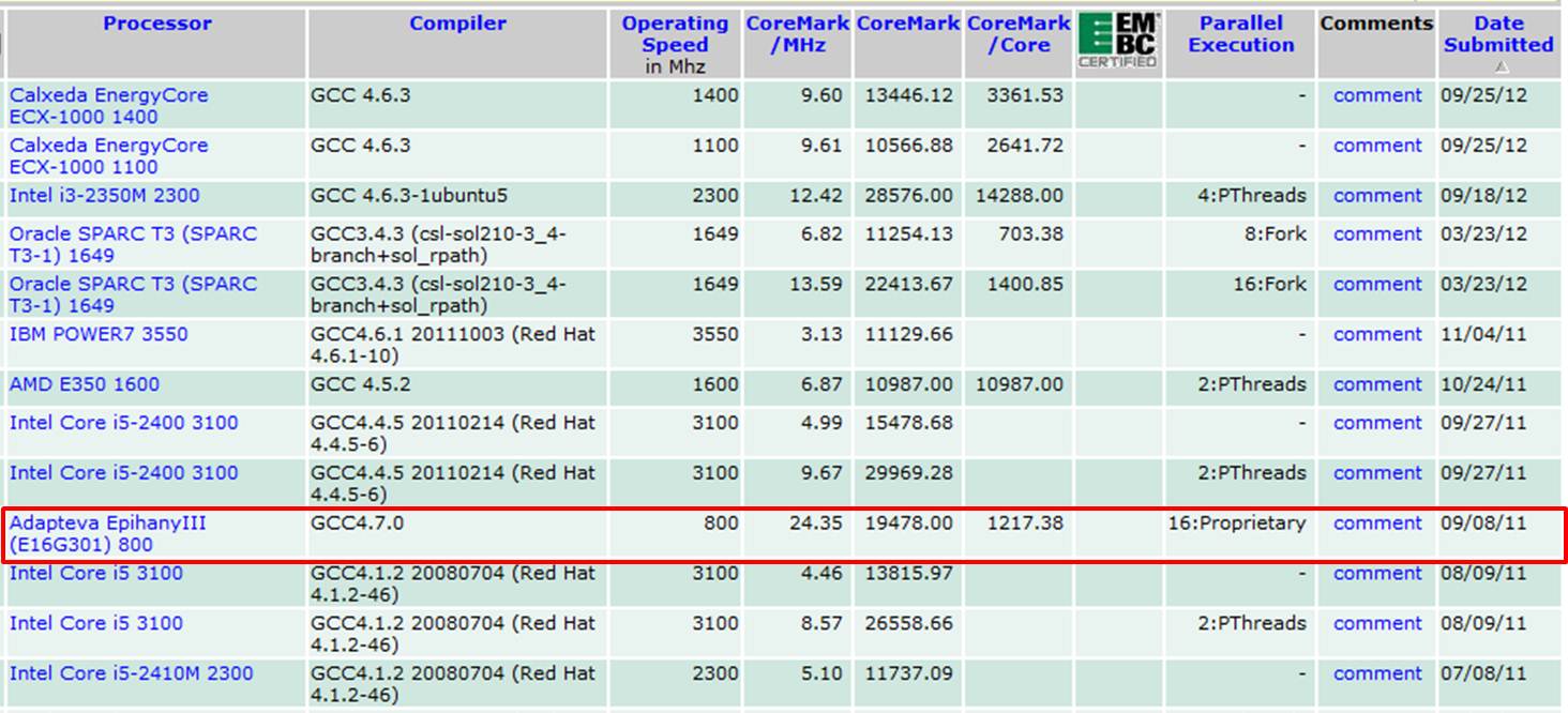 As a second comparison, here is a screenshot showing published results for some popular mobile processors in approximately the same power class as the Epiphany-IV processor as of October 17th,2012. The complete searchable list of CoreMark® benchmarks can be found at https://www.coremark.org.