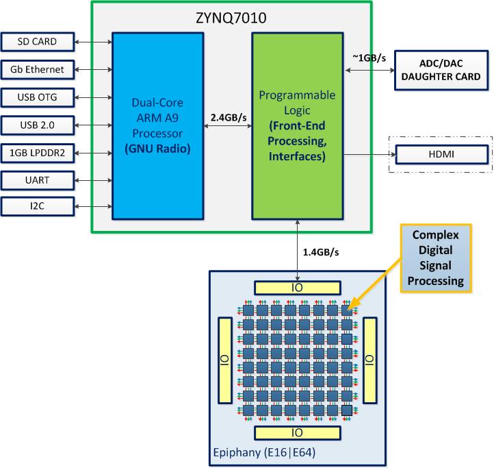The $99 Parallella board announced by Adapteva recently includes an Epiphany multicore DSP and a Xilinx Zynq-7010 with a dual-core ARM A9 CPU and on chip programmable logic. When combined with a daughter board containing an ADC and DAC, the Parallella board can be used to implement traditional SDR with tight high bandwidth host coupling and any other signal processing wanted. The software that normally runs on the remote host PC can now be run on the tightly coupled Dual-Core ARM A9 host processor in collaboration with the Epiphany multicore DSP. The ample single precision floating point performance offered by the Epiphany should make SDR development significantly easier. Using these Parallella kits the fast closed loop spectrum sensing required for a good Cognitive Radio implementation could also be explored, all within a tight budget and with a foot print of two stacked credit card sized boards.