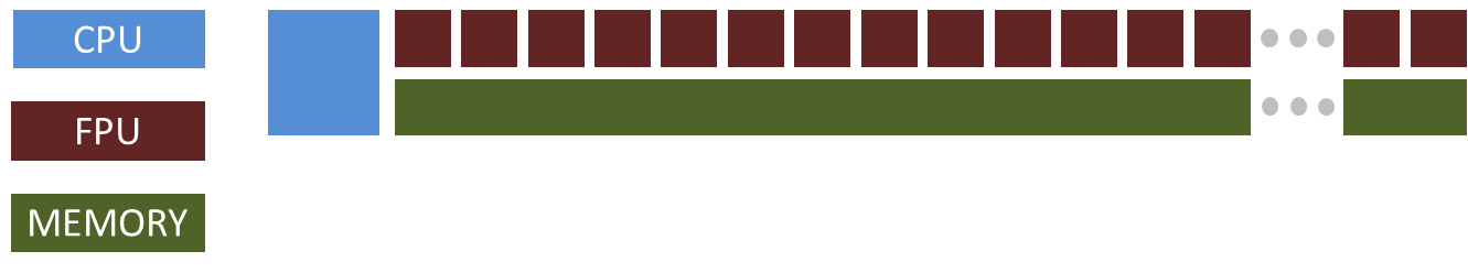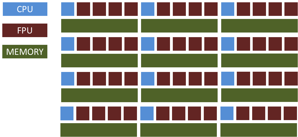 Scale performance by using many floating point units working in lockstep under the control of a single CPU. To reach 1 PFLOPS, use a 1GHz CPU that controls one million compute units working in lock step on one instruction at a time.