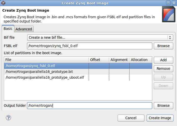 Note: To skip this step, use the previously downloaded BOOT image file (parallella16_prototype_sd_files/BOOT.BIN)