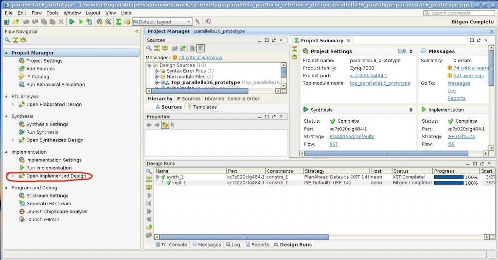 Note: To skip this step, use the previously downloaded bistream file (parallella16_prototype_sd_files/parallella16_prototype.bit)