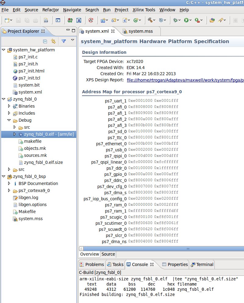 Note: This step is assumed to be performed from the earlier generated and implemented PlanAhead project, parallella16_prototype.ppr, as described in the Parallella Platform Reference Design user guide. To skip this step, use the previously downloaded FSBL executable file (parallella16_prototype_sd_files/zynq_fsbl_0.elf)