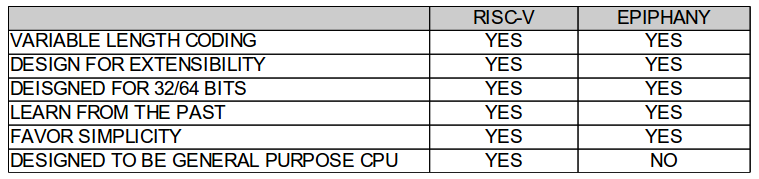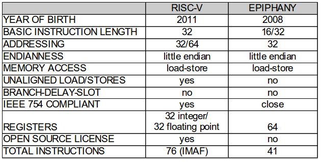 The book “Computer Architecture: A Quantitative Approach”, by John Hennessy and David Patterson was my constant companion during 2008 when I created the Epiphany architecture, so it should come as no surprise that the two architectures are more similar than different.:-) Having defended my own ISA choices for 6 years now, I can confidently state that there is no right answer to most of the “zero-sum” decisions that need to be made during the definition process. My favorite Fallacy/Pitfall advice from the Hennessy/Patterson book: