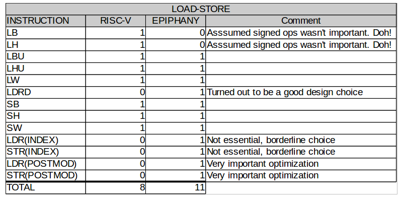 The RISC-V has support for loading signed byte and half word loads, which is clearly an important feature for working with signed byte and half word data types. Some may argue that the RISC-V could use more addressing modes to boost efficiency in compute intensive applications. True to its DSP heritage, the Epiphany architecture places more emphasis on addressing modes and even includes a postmodify addressing mode for accessing sequential in memory buffers more efficiently. The Epiphany also includes support for double word loads/stores which is needed to keep the floating point working at maximum capacity in most applications.