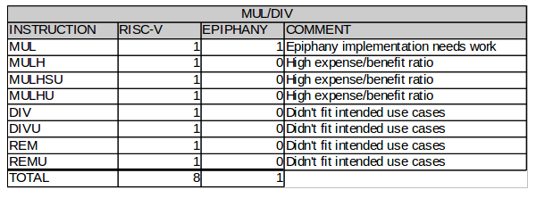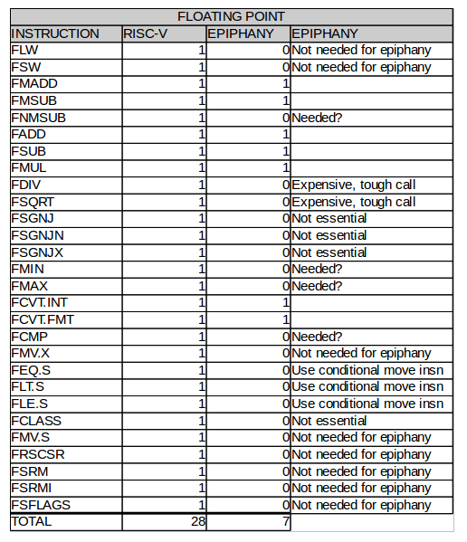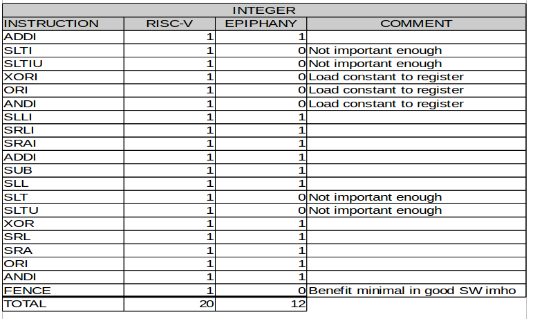 The RISC-V has significantly more integer instructions than Epiphany to support a broader set of applications. It should be noted that the Epiphany performs surprisingly well on non-DSP benchmarks despite its minuscule instruction set.[5] The ingenuity of compiler developers and the optimization prowess of state of the art compilers like GCC and LLVM should never be under estimated. The Epiphany does not include many operations on immediates because it was assumed to be: a.) non-essential, and b.) possible to implement these functions effectively with the compiler.